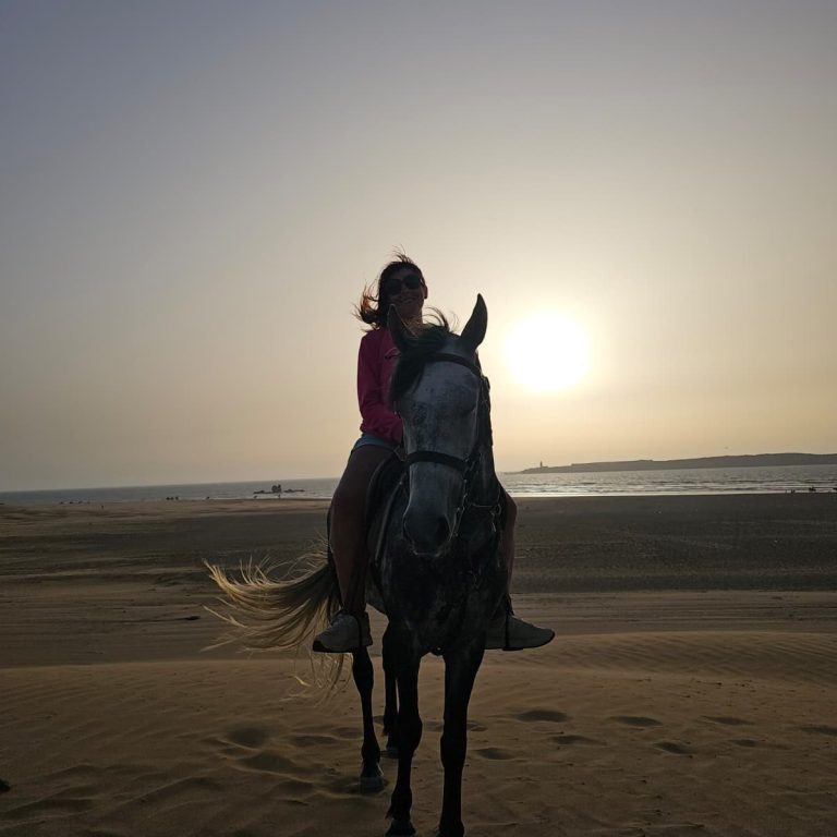 Montar a caballo por las playas ofrece una conexión única con la naturaleza y sus paisajes impresionantes. Cada paseo es una oportunidad para relajarte y disfrutar de la esencia del entorno marroquí.